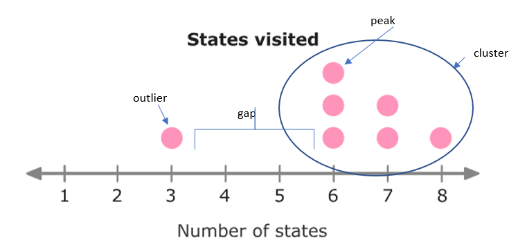Draw the dot plot. Identify the cluster(s), peak(s), and gap(s).