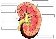 Renal capsule, renal cortex, renal artery, renal vein, renal medulla, renal pelvis, renal pyramids, and nephron
