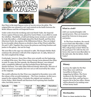 Which section is most likely to give information about different Star Wars products that you can buy?