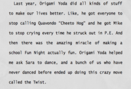 Reread paragraph 2 from the story. What do these sentences show about Origami Yoda?