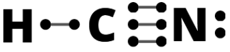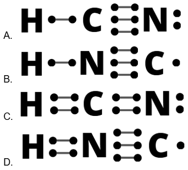 El Nitrógeno es un elemento que presenta 5 electrones de valencia, el carbono 4 y el hidrógeno 1. Si juntamos un átomo de cada uno para formar la molécula ácido cianhídrico (HCN), teniendo en cuenta los electrones de valencia, seleccione la estructura de Lewis que cumple el octeto para la molécula.