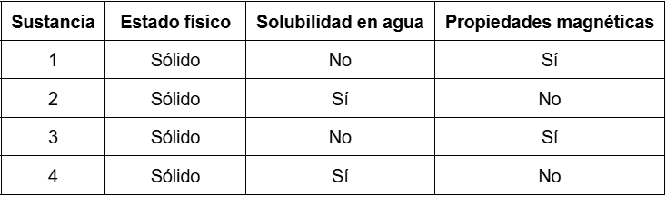 La siguiente tabla muestra algunas propiedades de cuatro sustancias.