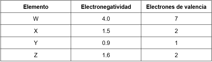 La siguiente tabla presenta la electronegatividad de 4 elementos (W, X, Y, Z) así como sus electrones de valencia: