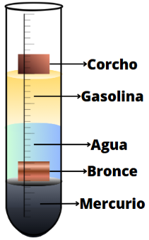 En un recipiente se vierten 10 mL de agua, 10 mL de gasolina y 10 mL de mercurio. Cuando a la mezcla se le adiciona un trozo de corcho y un trozo de bronce y se deja en reposo, se observa la distribución mostrada en la imagen: