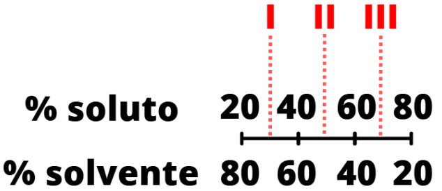 La siguiente recta numérica indica la relación porcentual en una mezcla homogénea entre el ácido acético (soluto, temperatura de ebullición 120 °C) y el agua (solvente , temperatura de ebullición 100 °C).