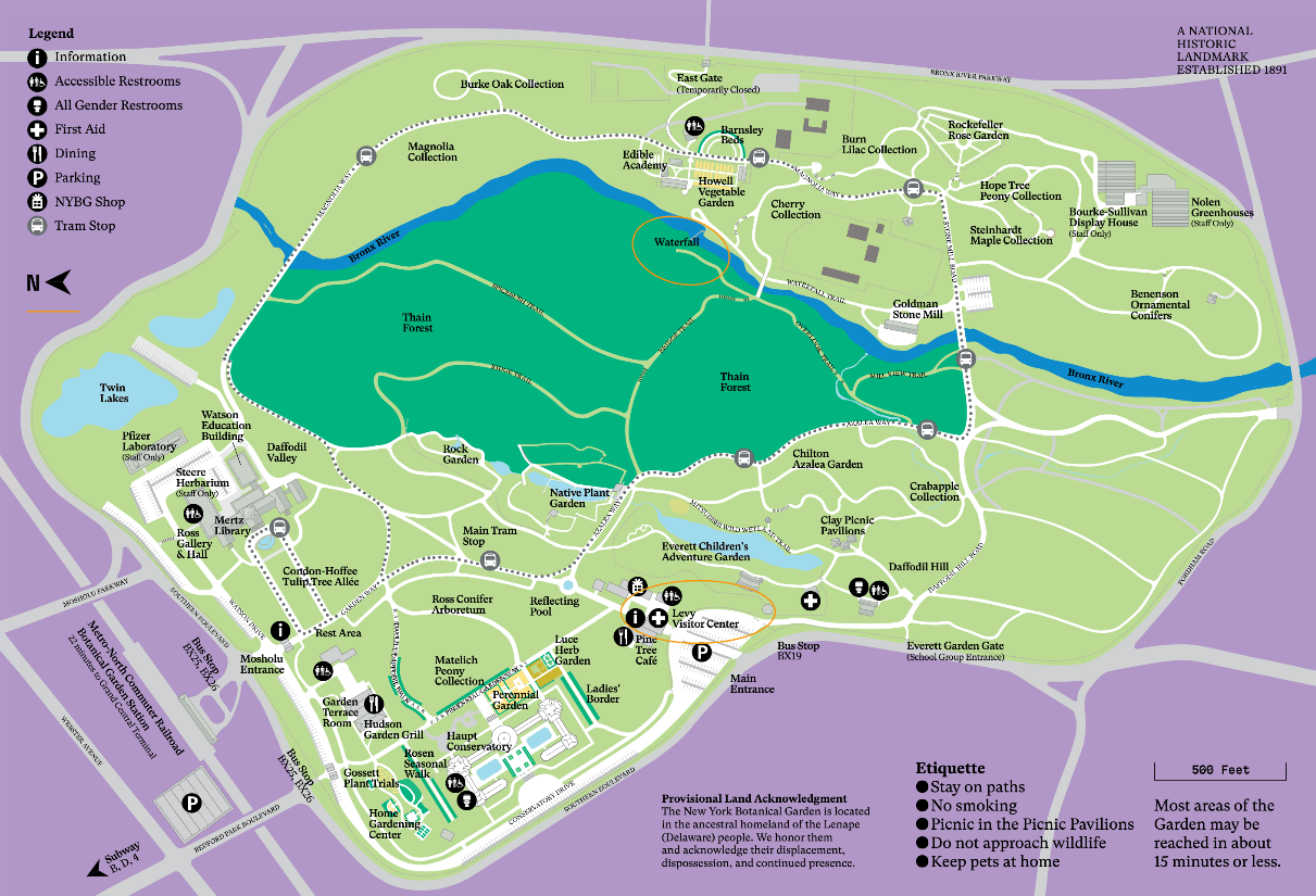 In the NY Botanic Garden, this is the direction you go to walk from Levy Visitor Center to the Waterfall.