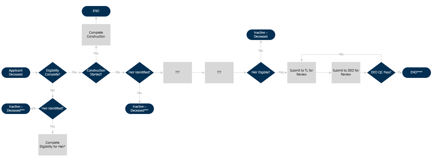 Applicant has signed an HGA, but the project has not proceeded to construction when the applicant passes away. An heir has contacted the program to notify HRRP of the applicant's passing. What is the next step?