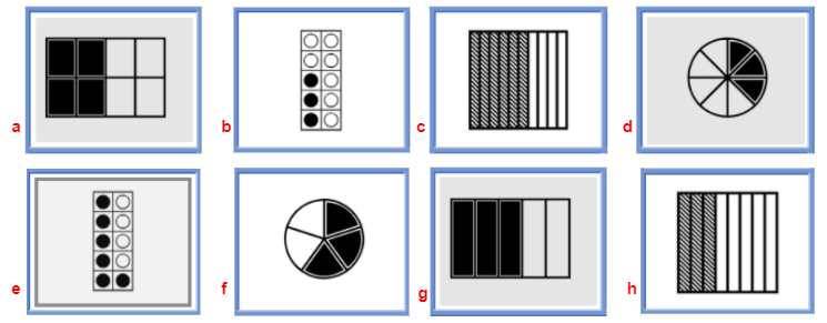 c (6/10), e (6/10), f (3/5 is 6/10) and g (3/5 is 6/10)