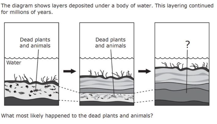 Became fossil fuels (coal, oil, natural gas) from the heat and pressure of the layers