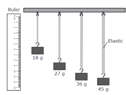 A student designs an experiment to test how the width of elastic affects the elastic's ability to stretch. The student uses 4 pieces of elastic with different widths (thickness). Blocks of different masses are attached to each elastic as pictured.
