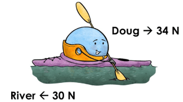Doug is paddling with more force forward than the river is flowing backward. Forces are unbalanced; Doug is moving closer to land