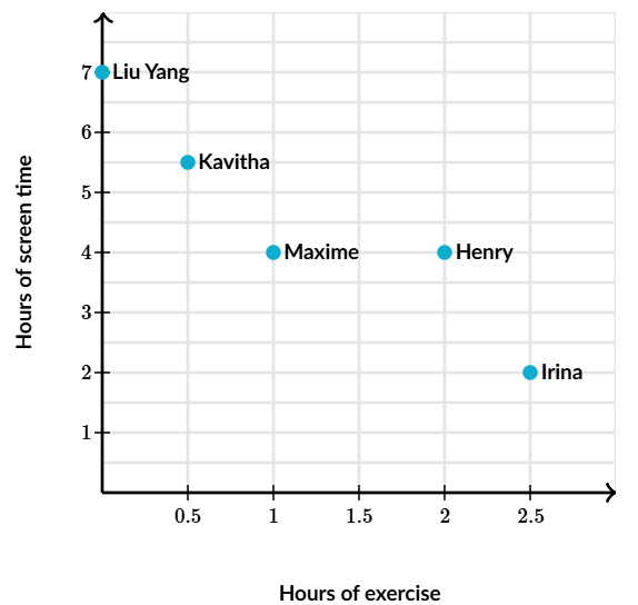 The graph shows the relationship between hours of exercise and hours of screen time for a group of 5 friends on Thursday. What is the meaning of the point marked Maxime?