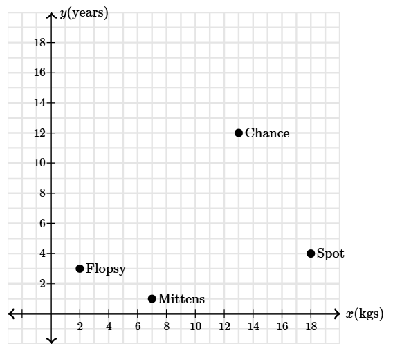 Tyler collected data on his pets. The points show the age and mass of 4 of his pets. Which of Tyler's pets are younger than Spot?