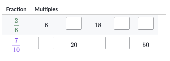1. List the first five multiples of the denominator in each fraction in order of least to greatest.