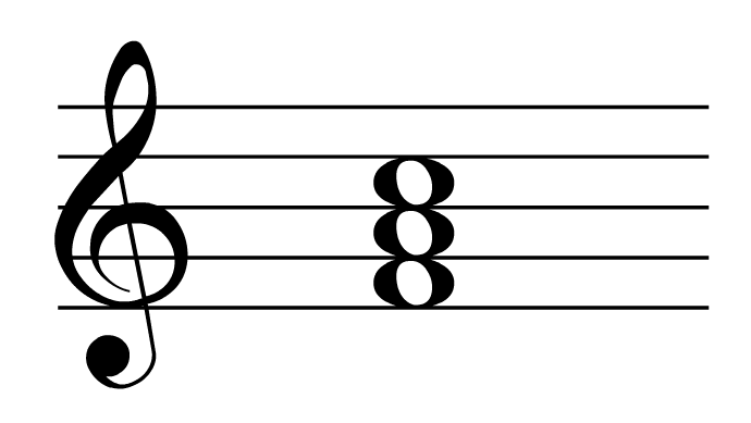Please write an A chord in three ways: letters, on the staff, and by number.
