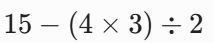 Subtract from 15 the result of multiplying 4 by 3 and then dividing by 2.