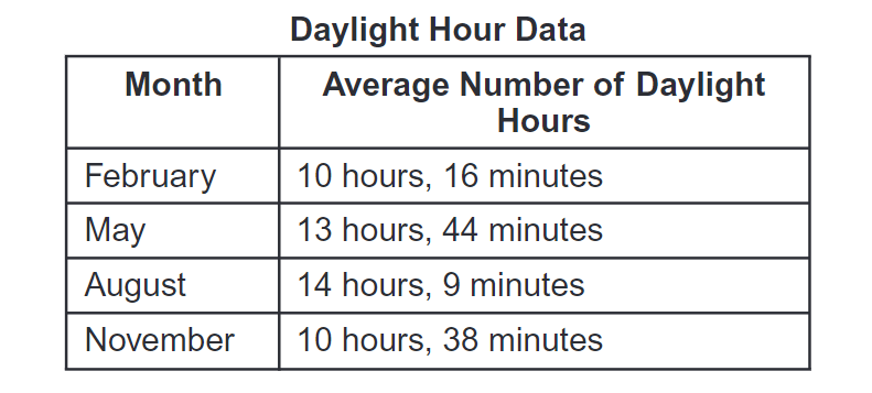 A student in Missouri records the average number of daylight hours during 4 months of the year. The results are shown in the data table below. Which conclusion is BEST supported by the data provided?