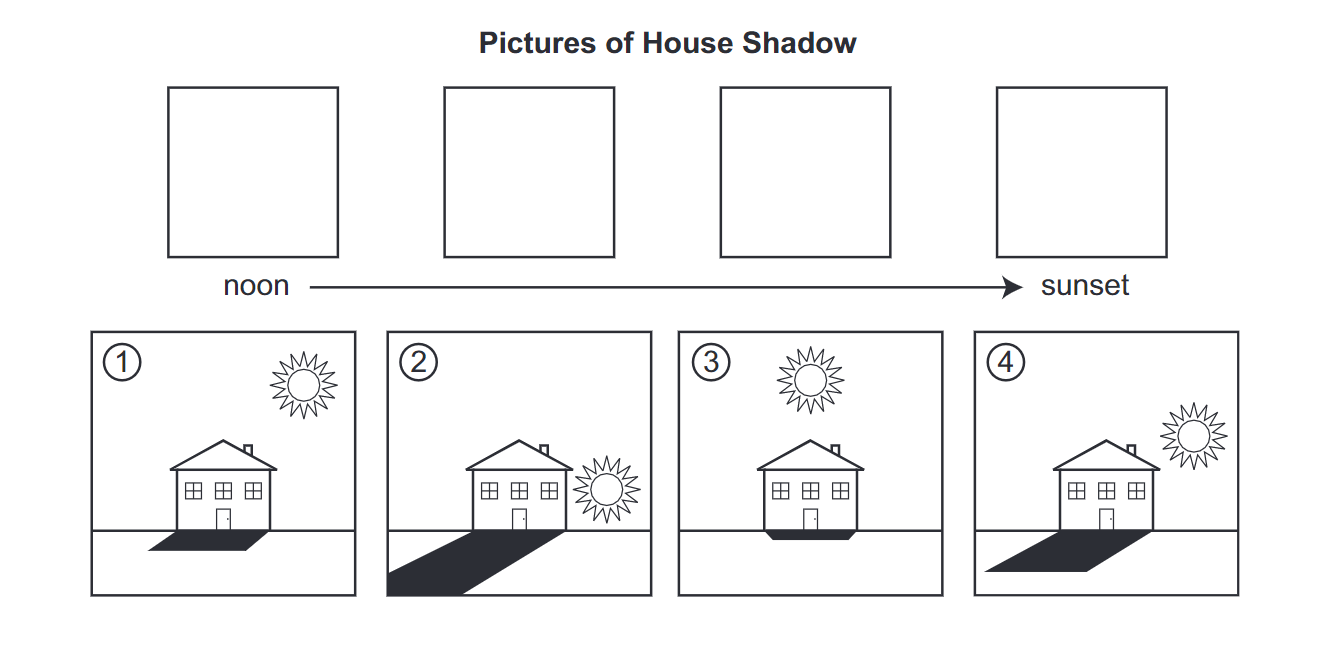 A student takes a picture of the shadow of a house at 4 different times during one day. The pictures are shown below, but they aren't in order according to the time they were taken. Identify the correct order of the pictures according to the time of day when each picture was taken.