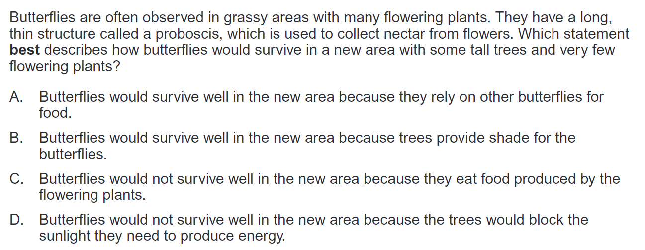 C. Butterflies would not survive well in the new area because they eat food produced by the flowering plants.