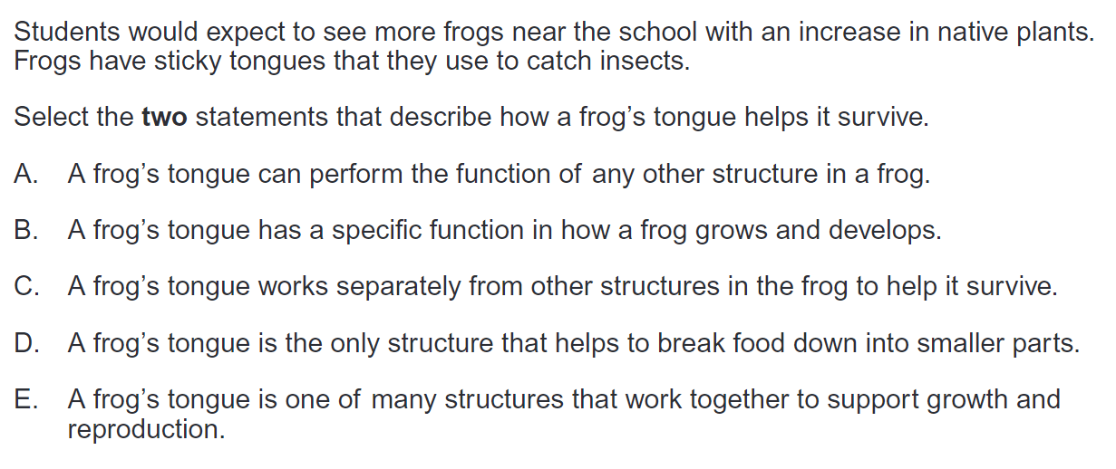 E. A frog’s tongue is one of many structures that work together to support growth and reproduction.