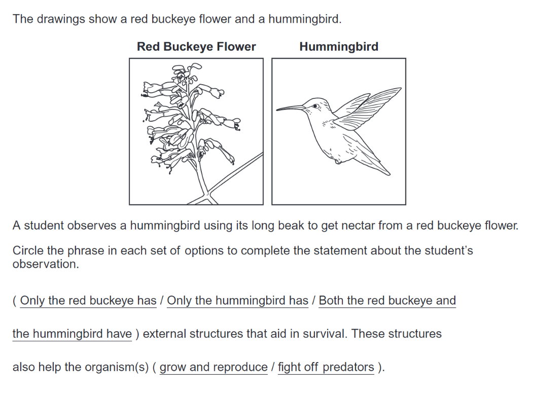 Both the red buckeye and the hummingbird have; grow and reproduce