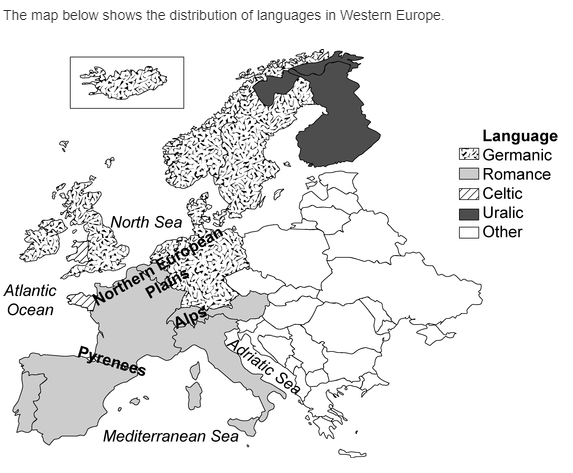 What geographic feature most likely explains the difference between the languages spoken in Germany and Italy?