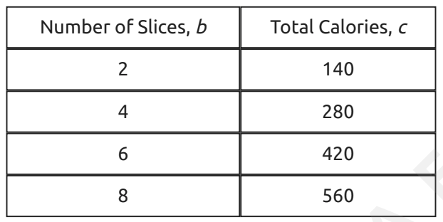 The table shows the relationship between b, the number of slices of bread, and c, the total number of calories in the bread.