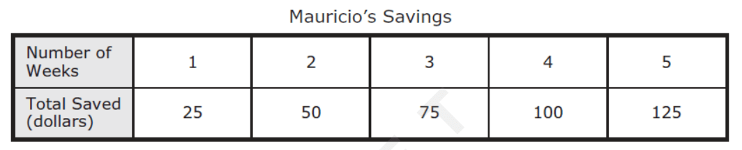 Mauricio saves the same amount from his paycheck each week. The table shows the total amount of money saved based on the number of weeks. List the dependent quantities from the table.