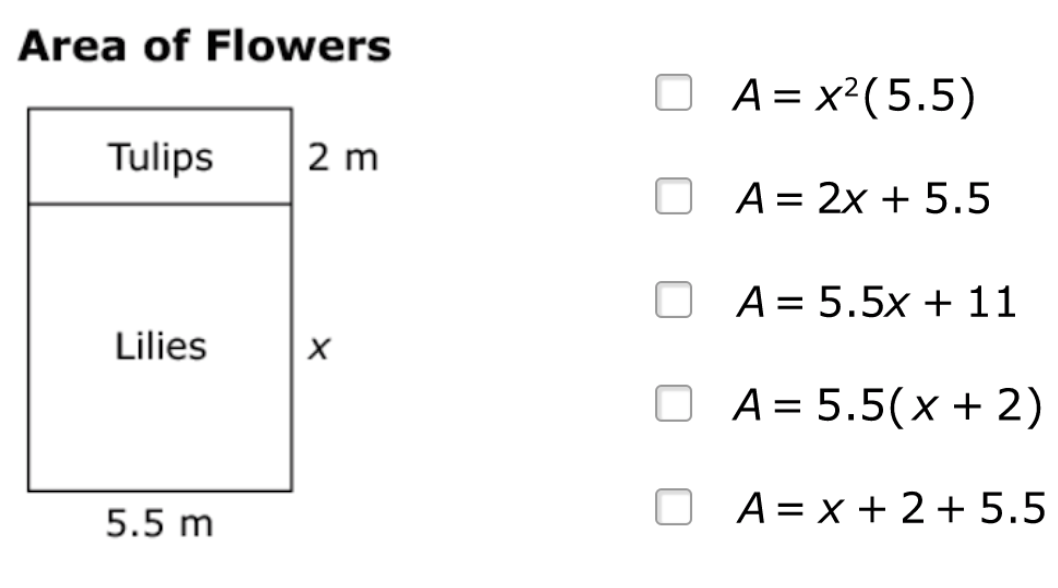 Jeremiah planted tulips and lillies in a field with a width of 5.5 meters. The field of flowers is shown. Which equations could be used to find the area of the field of flowers for any length, x?