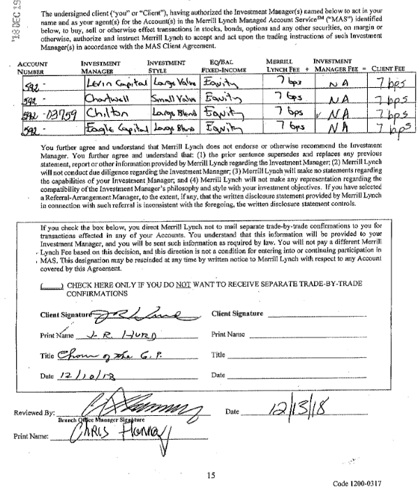 DAILY DOUBLE: This document shows Merrill and Manager fee rates and trade confirmation election; for MAS it requires client + branch manager signatures