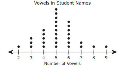 Ms. Gonzales gathered data on the number of vowels in the first and last names of each of her students. The data are shown in the dot plot.
