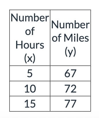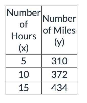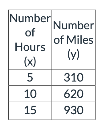 Brayden drives from San Francisco to Kansas City at a constant rate of 62 miles per hour.  Which table represents y, the number of miles Brayden drives to x, the number of hours?