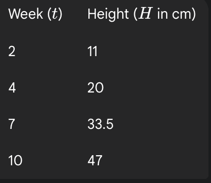 A botanist is tracking the growth of a sunflower seedling over several weeks. The table below shows the height of the seedling, H, in centimeters, measured at the end of week t.  What is the average rate of change?