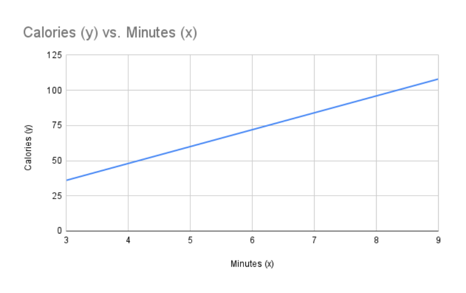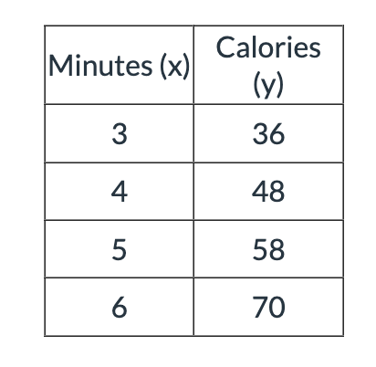 A person burning 300 calories in 25 minutes on the elliptical.  Which equations, tables or graphs show the relationship between the number of minutes, x, and the total calories, y?  Select TWO correct answers.