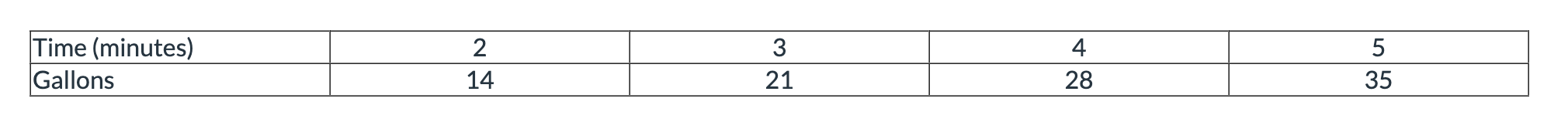 A tank is filling with water. After 2 minutes, it contained 14 gallons. After 5 minutes, it contained 35 gallons.