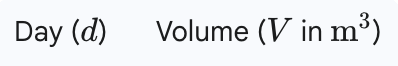 A water management team is monitoring the volume of water in a local reservoir during a dry season. The table below shows the reservoir's volume, V, in cubic meters (m3), measured at the beginning of day d. What was the average rate of change of the reservoir's water volume, in cubic meters per day?