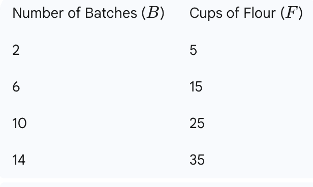 A baker is making large batches of chocolate chip cookies. The table below shows the relationship between the number of batches made, B, and the total number of cups of flour needed, F.  If the relationship is proportional, find the constant of proportionality.