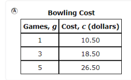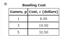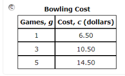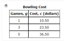 A bowling alley charges $6.50 per game played and $4.00 for shoe rental. Which table shows the cost, c, of renting shoes and playing g games of bowling?