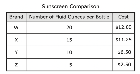 Imani compared the number of fluid ounces per bottle of sunscreen to the cost of four different brands of sunscreen. The information she gathered is shown in the table.