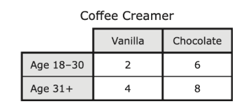 The manager of a coffee shop recorded the number of customers who put vanilla creamer or chocolate creamer in their coffee during on hour and classified them by age. The results are shown in the table.