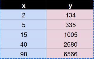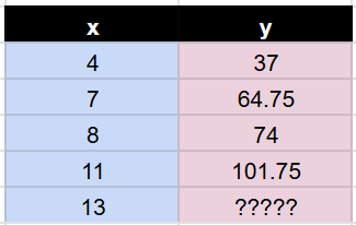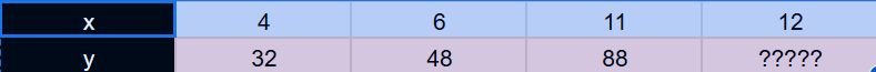 The following table represents the distance in miles Chino travels on his bike (y) after a variable number of hours (x). Assuming that Chino rides his bike at a constant rate, how many miles will he have travelled after 12 hours?