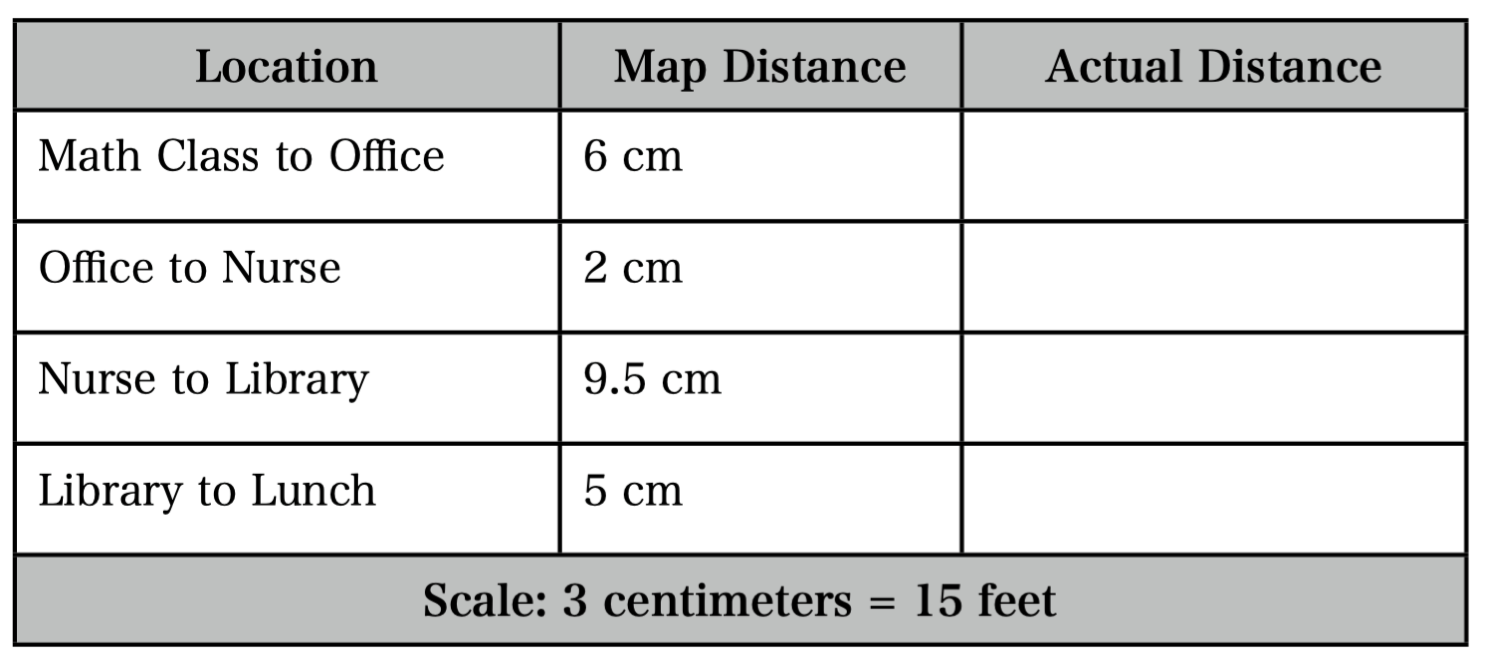 Ally made a scale drawing of her bedroom. She used a scale factor of 2 centimeters = 1.5 feet. If her drawing measures 10 cm x 15 cm, what are the actual dimensions of her room?