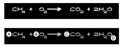 An unbalanced equation is shown here. Below it is a diagram with four locations in the unbalanced equation labeled. The equation could be balanced by adding a number two (2) in which location?