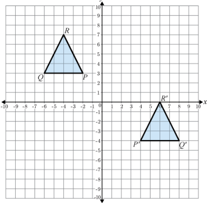 Two triangles are shown on the coordinate plane. Describe a transformation or sequence of transformations that shows triangle PQR is similar to P'Q'R'.