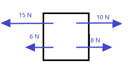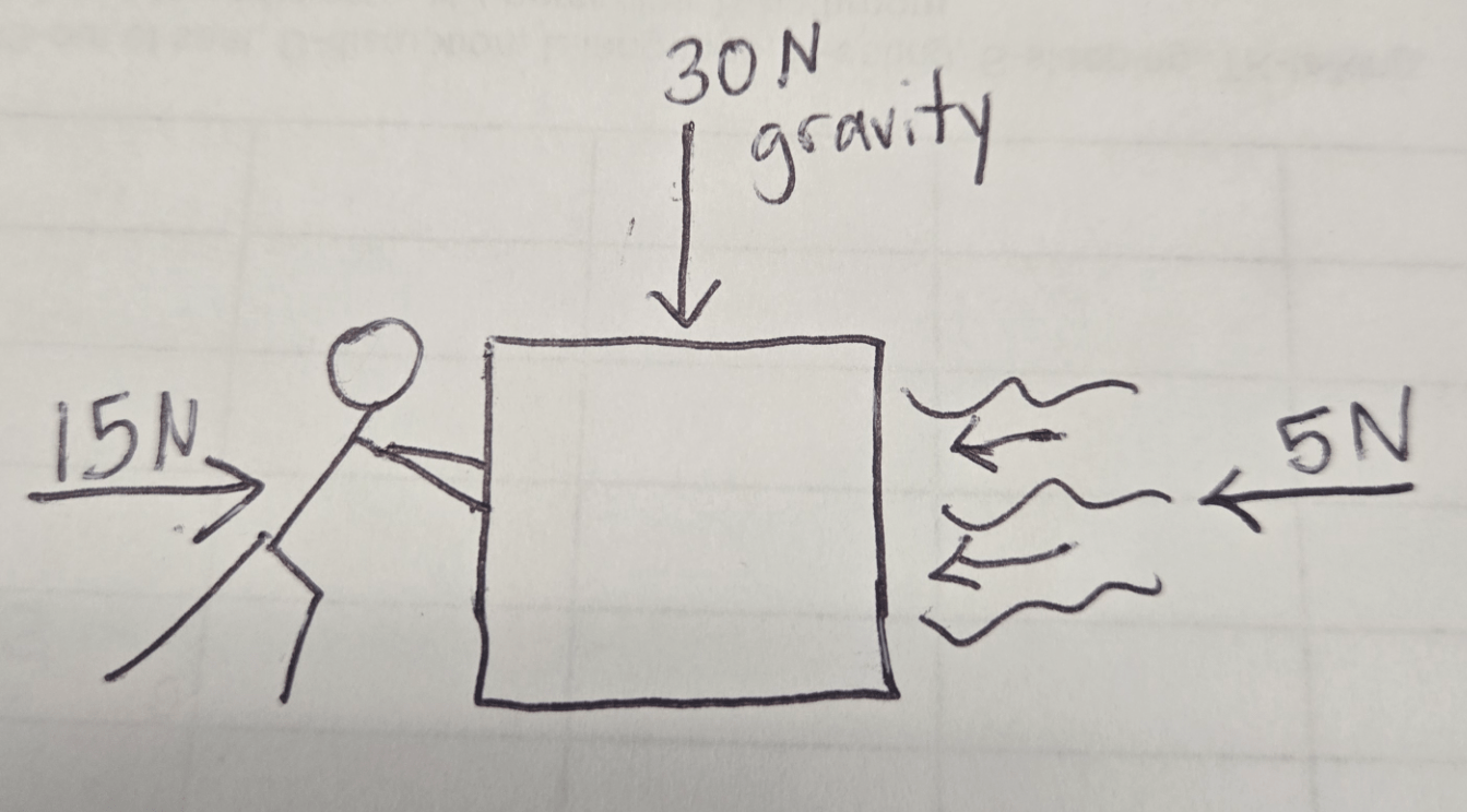 Draw a net force diagram for a box that has 30 N of gravity pulling down on it, while a man pushes it with a force of 15 N to the right, while a 5 N wind pushes against the box to the left.