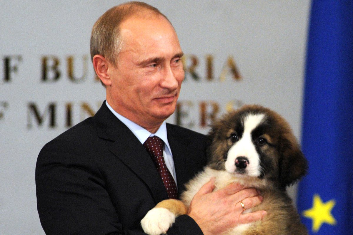 В руках у него собака. Он носит элегантный костюм чёрного цвета, белую рубашку и галстук тёмно-красного цвета.