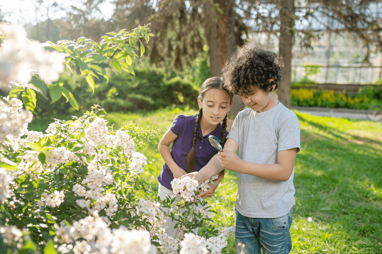 My brother and I are in the garden.
