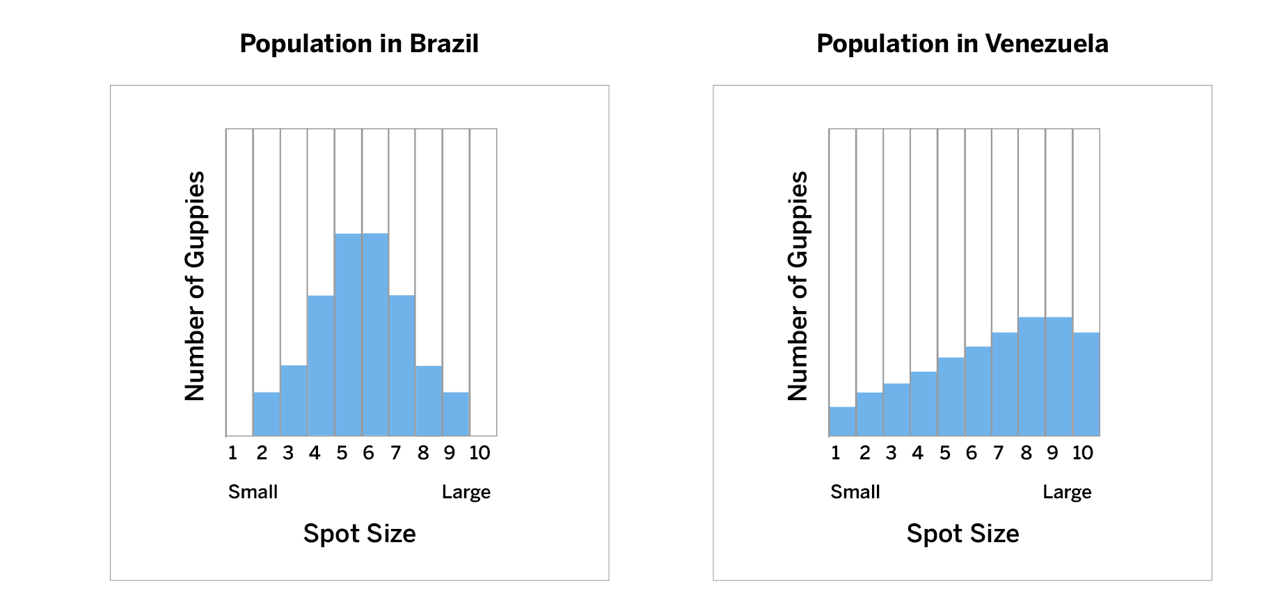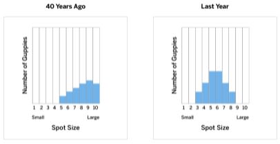 Scientists measured the spot size of guppies (small fish) in two different populations. Which population has more guppies with large spots?