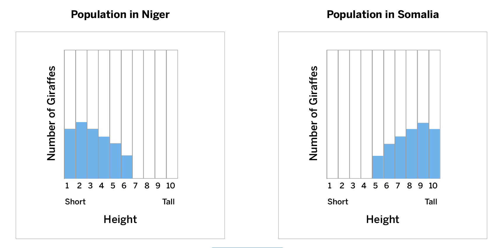 Scientists measured the height of the giraffes in two different populations. Which population has the largest number of tall giraffes?
