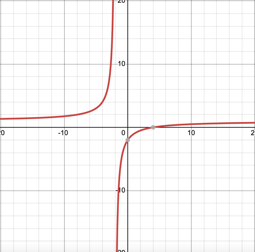 Vertical asymptote at x = -2, Horizontal asymptote at y = 1, x - intercept at (4, 0) and y - intercept at (0, -2)
